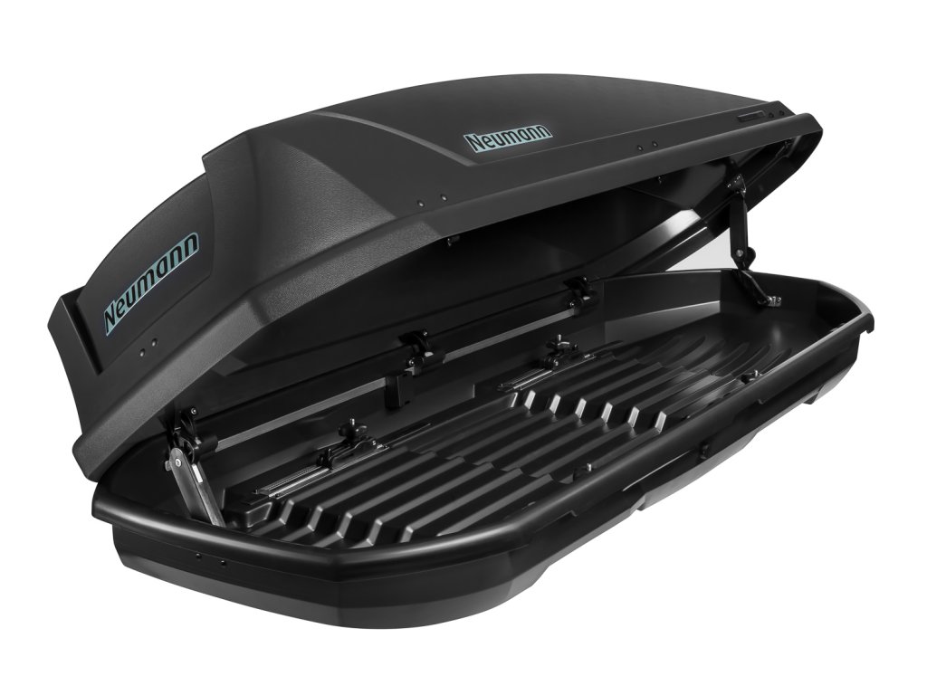 Ekonomická verze střešního boxu Autobox NEUMANN Adventure 205 antracit od tuzemského výrobce s jednostranným otevíráním a upínáním klasickými U-profily/třmeny s maticí.